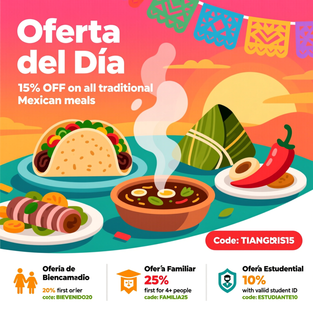 - 15% de descuento en todos los pedidos de comida mexicana tradicional