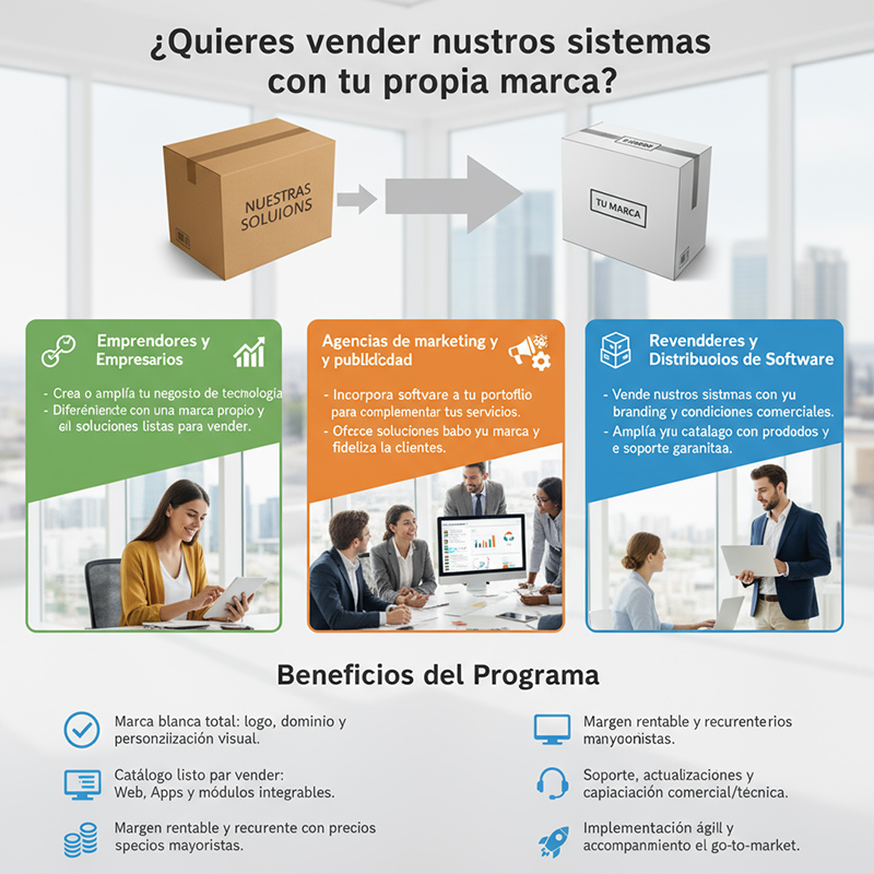Únete a nuestro programa de marca blanca y comercializa nuestras soluciones Web y Apps como si fueran tuyas. Nosotros desarrollamos y damos soporte; tú escalas tu oferta y tus ingresos.