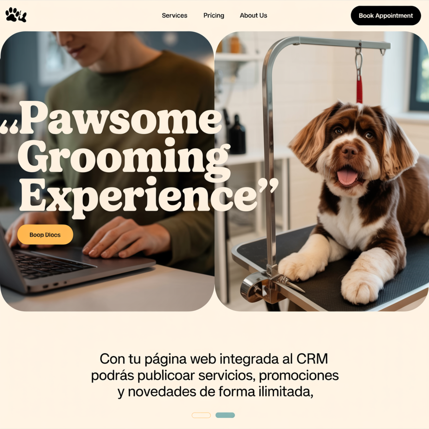 Brindar servicios de estética canina con altos estándares de calidad, utilizando nuestra plataforma CRM y página web para optimizar la gestión, facilitar la comunicación con los clientes y ofrecer una experiencia digital eficiente, segura y orientada al bienestar de cada mascota.