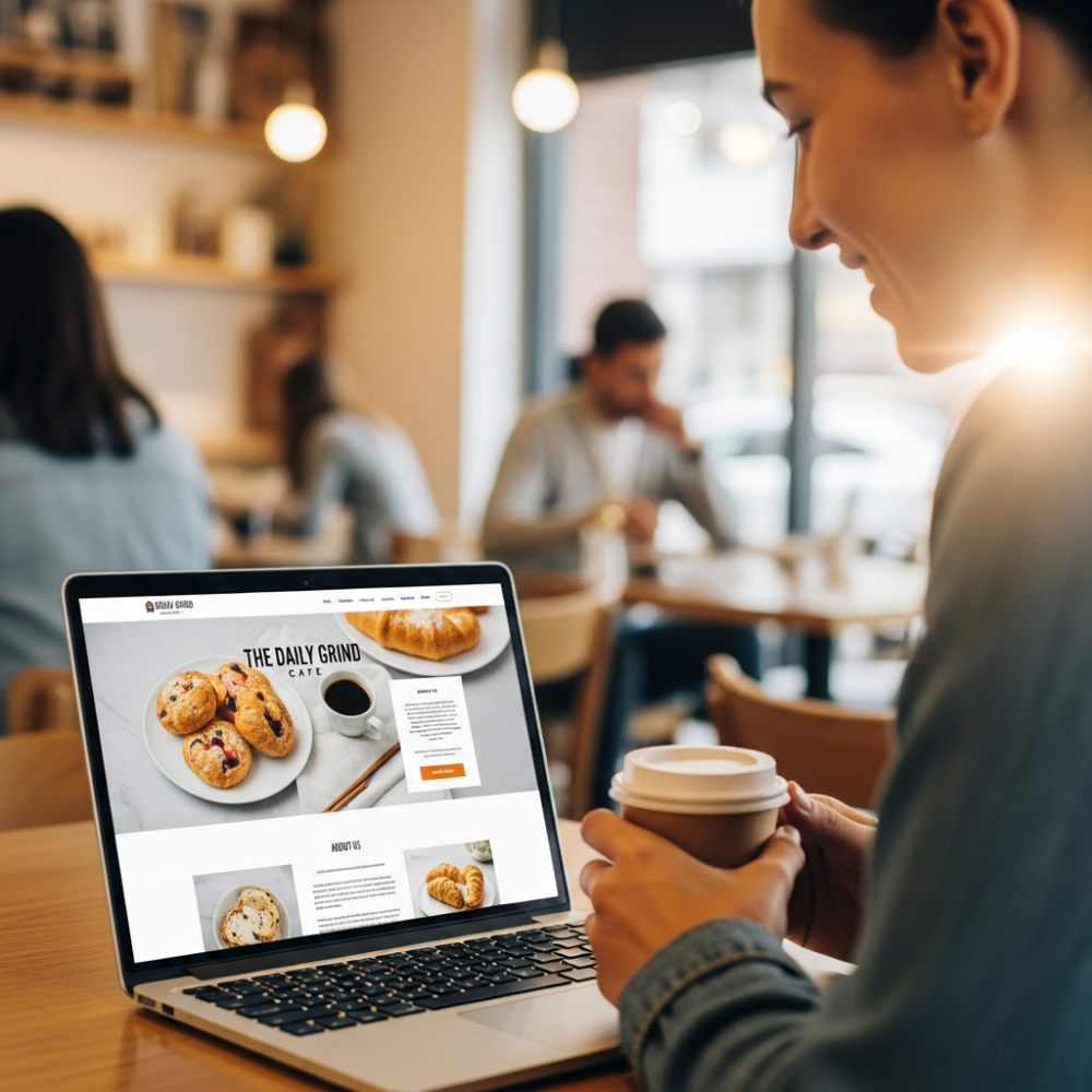La página web integrada permite a la cafetería publicar contenido ilimitado, mostrar productos y fortalecer la relación con los clientes, mejorando la visibilidad del negocio y facilitando la comunicación directa.