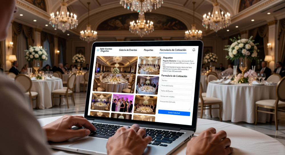 La plataforma crea automáticamente una página web profesional para el salón donde se muestran instalaciones, paquetes, galería de eventos, servicios y formulario de cotización. Esto permite que los clientes conozcan el lugar, vean eventos reales y soliciten información fácilmente desde internet.