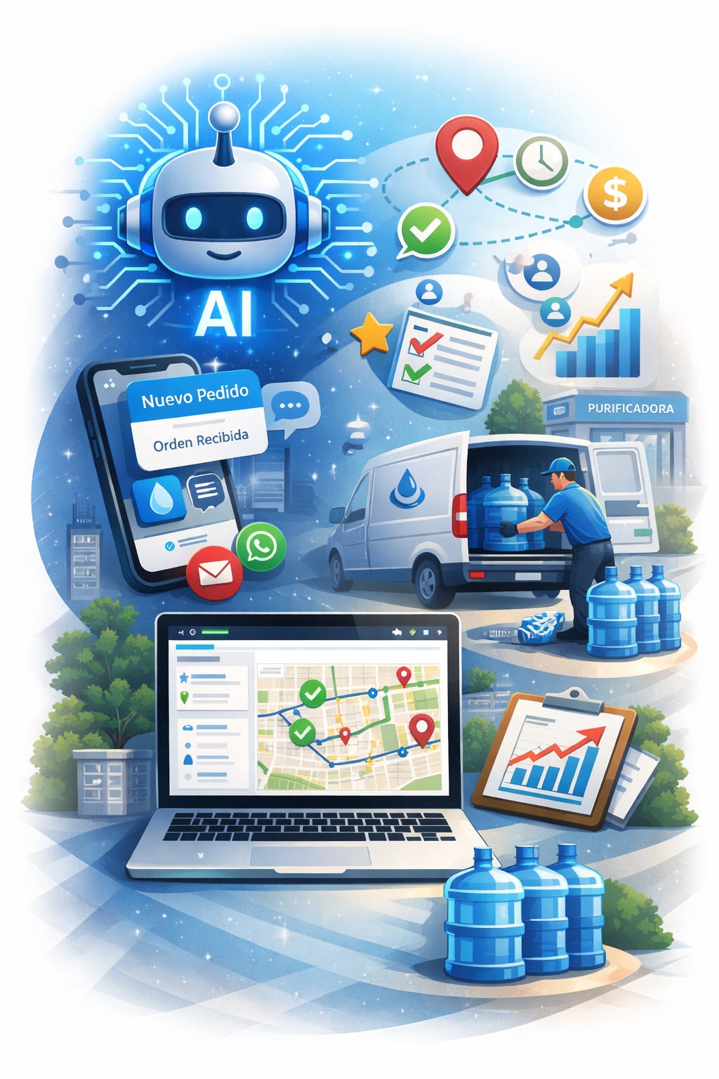 Automatiza pedidos, optimiza rutas y posiciona tu purificadora por encima de la competencia.