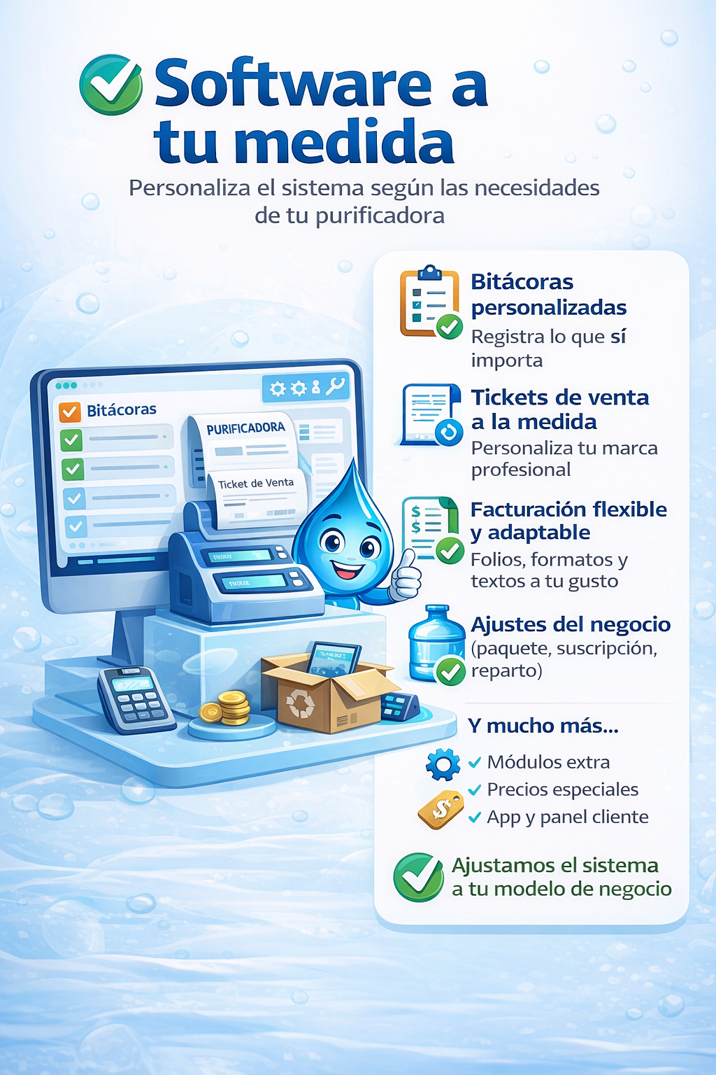 Sabemos que no todas las purificadoras trabajan igual, por eso el sistema se adapta a tu forma real de operar. Puedes personalizar módulos completos o solo lo que necesitas.